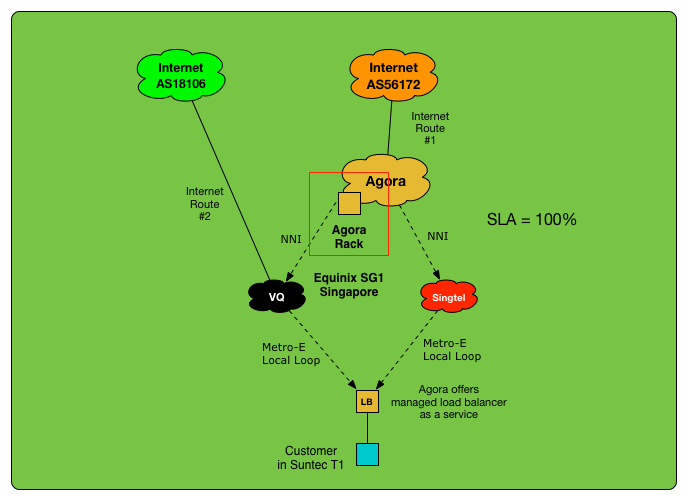Agora works with state of the art load balacing equipment vendors and service operators to provide cost effective & reliable Internet network to Corporate Enterprise. A load balancer is a network equipment that intelligently connects to two different routers connecting to two different ISP. Because Agora is Telco-Neutral service provider, means, we can buy from any two ISP and provide the managed load balancer service to you. Why your network need to depend on single ISP, and thus single point of failure? For those companies who demand 100% SLA, Agora has the perfect sollution for you.
